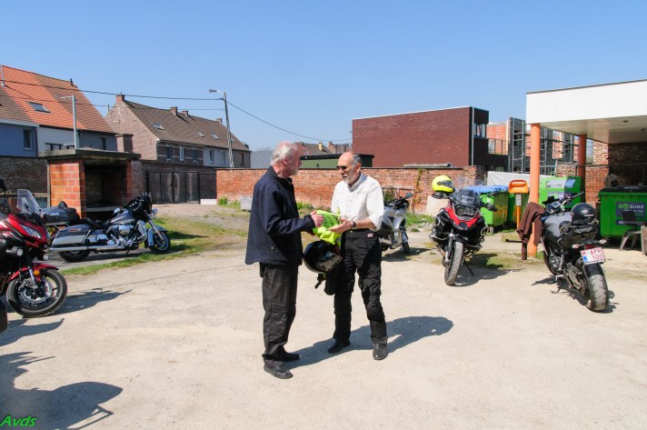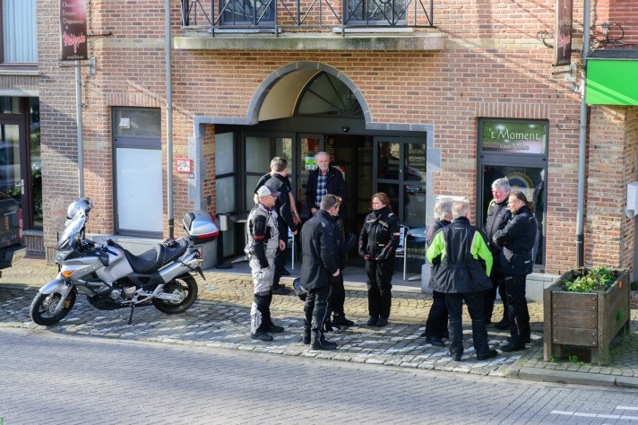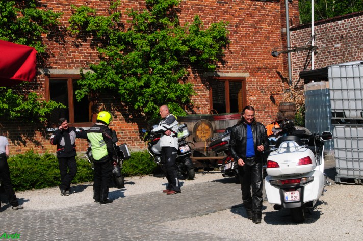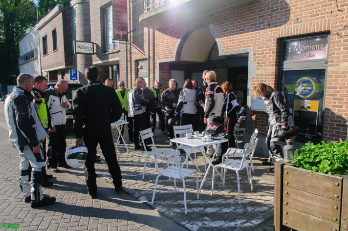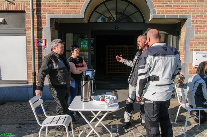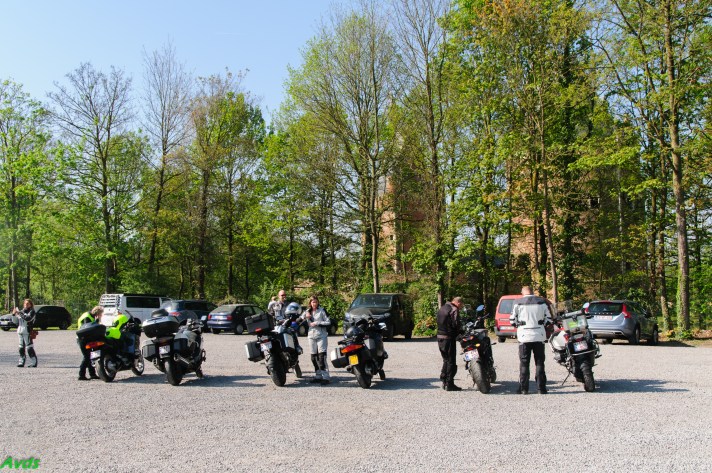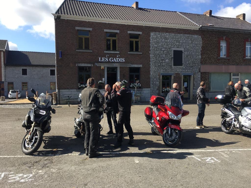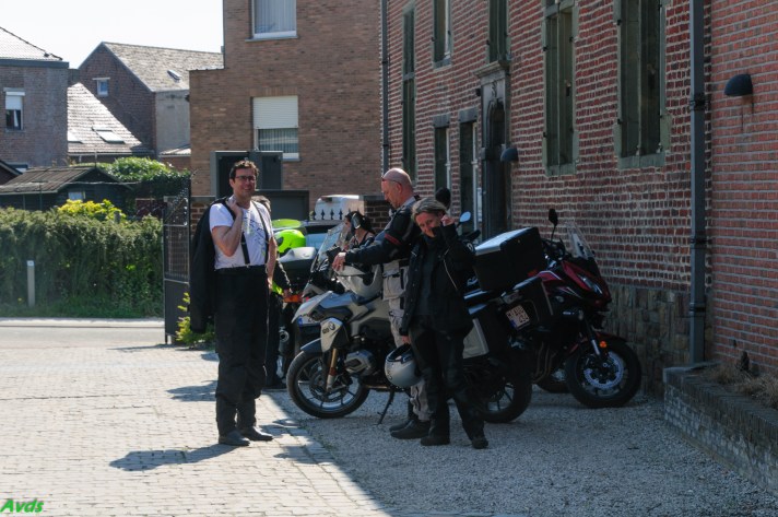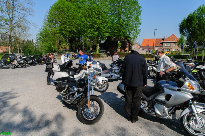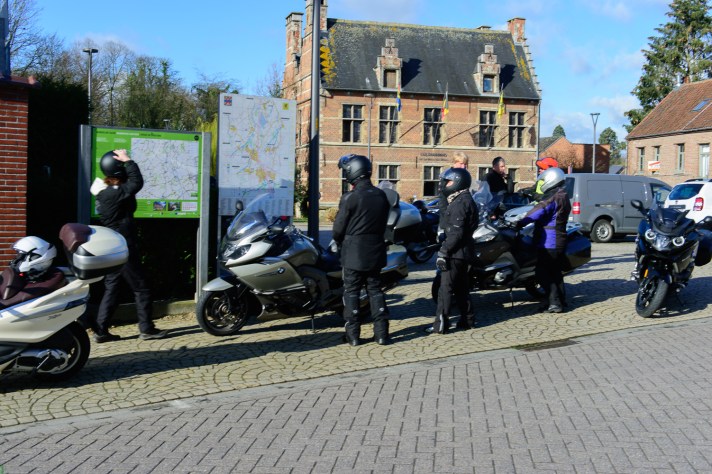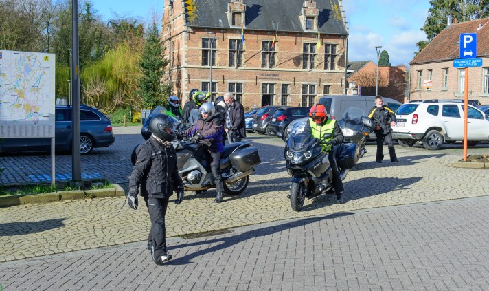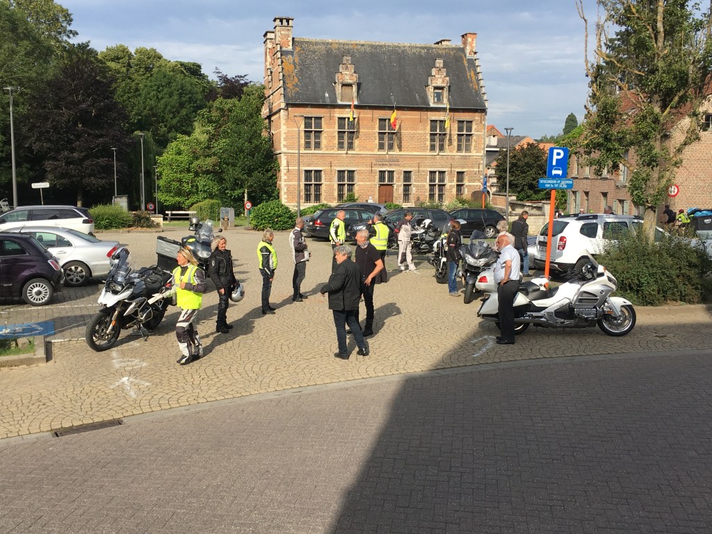 Om 09.30 uur stonden een 20 tal motoren en 26 motards klaar om te vertrekken. En waarlijk , het vertrek was feilloos. Groep 1 voor de kerk , groep 2 op de grote parking en groep 3 bij Emmanuel Van der Linden d’ Hooghvorst . En de baron zag dat het goed was -)