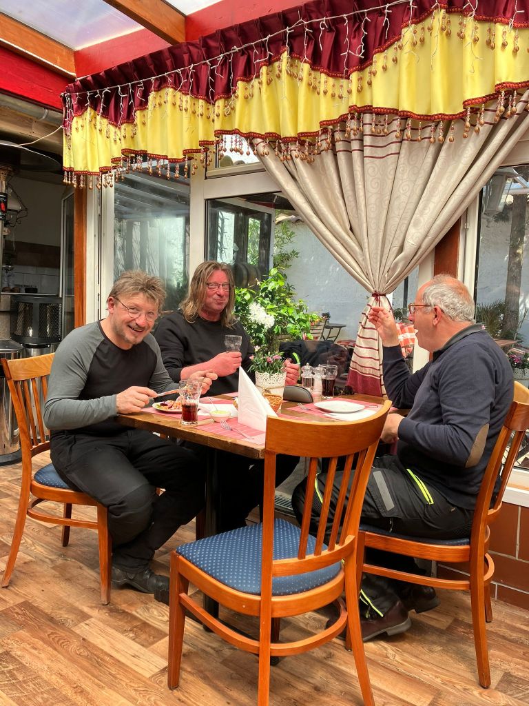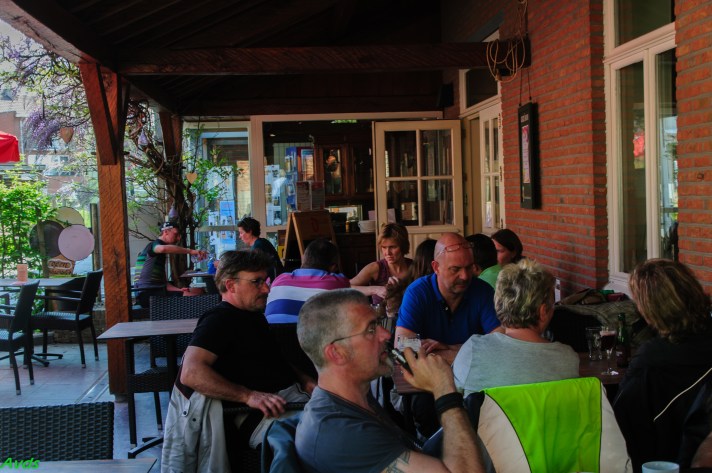 De route verliep verder door het Dender – en Scheldeland . Even een druk moment ter hoogte van Dendermonde . Via Hamme en Temse kwamen we na 35 km in Weert , aan taverne ” Oud Gemeentehuis “. Daar vingen wij bot . Geen plaats en werden we , bij wijze van spreken ,wandelen gestuurd . Geen nood . We besloten de laatste 35 km richting Meise dan maar aan te vangen. We wisten dat Marina van ’t Moment op ons zat te wachten .