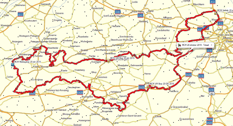 Via het heuvelland , in de buurt van Sint Antelinks en Herzele bromden we verder langs Erpe-Mere en Aalst naar onze middagstop voor de lunch.